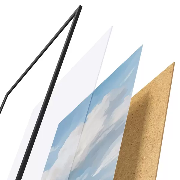 El póster consta de marco, plexiglás, imagen impresa y soporte de aglomerado. El póster puede colgarse inmediatamente en la pared gracias a los soportes de la parte posterior.