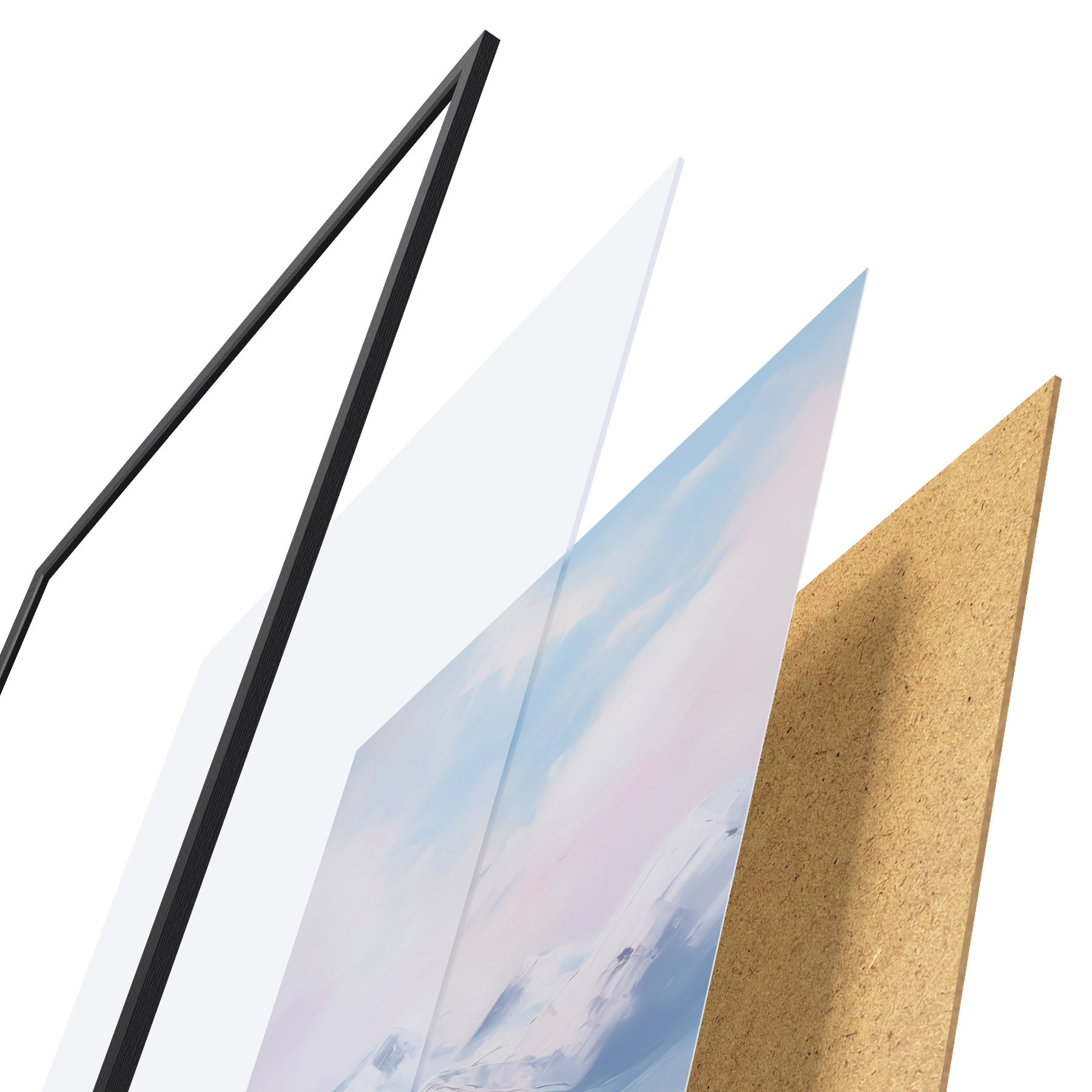 El póster consta de marco, plexiglás, imagen impresa y soporte de aglomerado. El póster puede colgarse inmediatamente en la pared gracias a los soportes de la parte posterior.