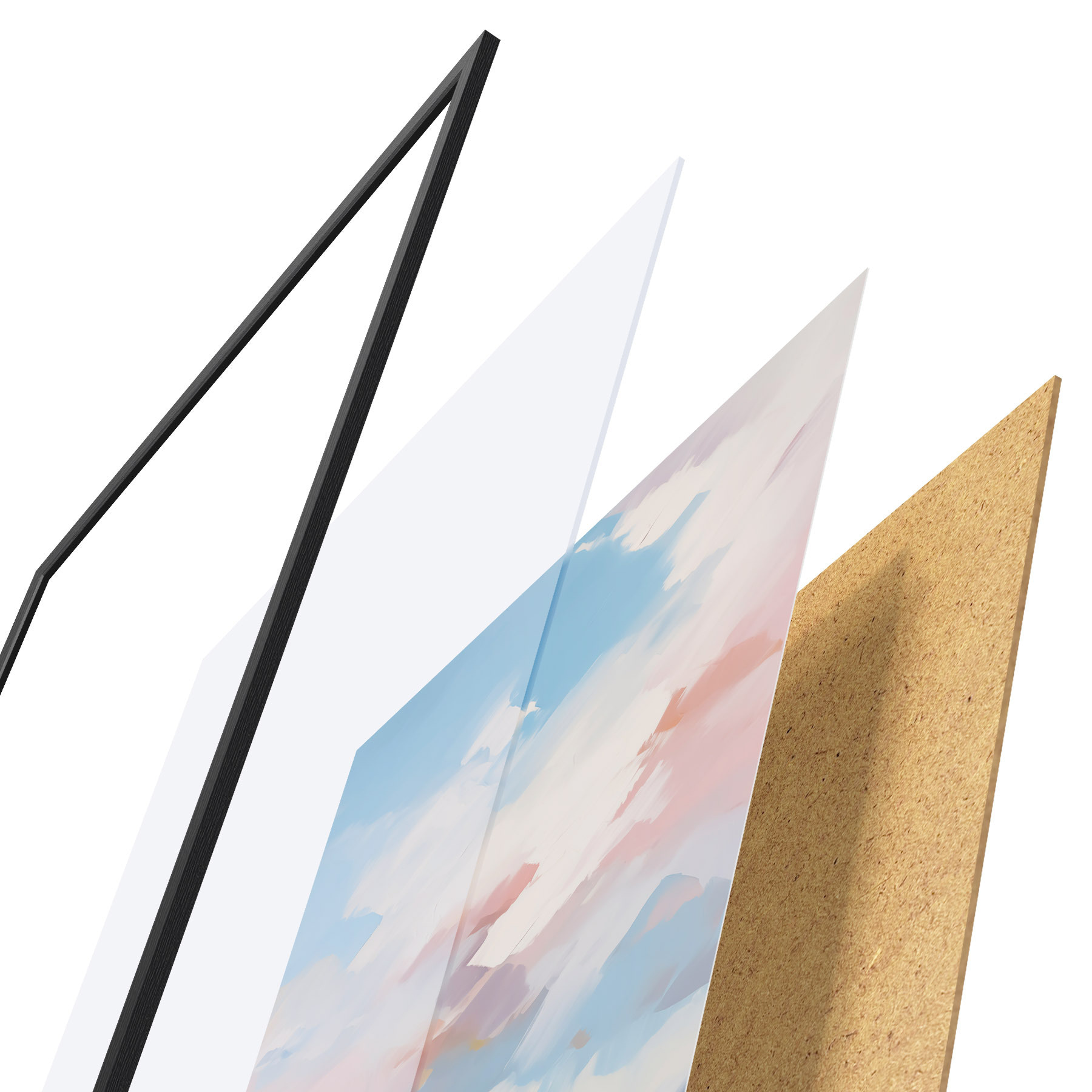 El póster consta de marco, plexiglás, imagen impresa y soporte de aglomerado. El póster puede colgarse inmediatamente en la pared gracias a los soportes de la parte posterior.