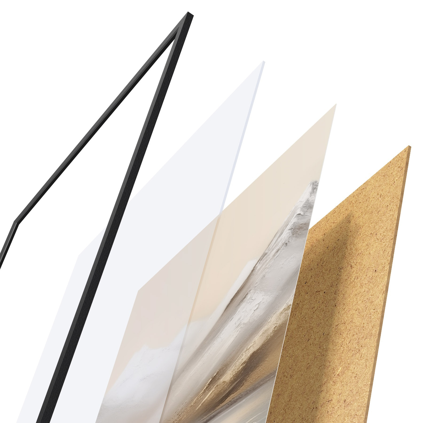 El póster consta de marco, plexiglás, imagen impresa y soporte de aglomerado. El póster puede colgarse inmediatamente en la pared gracias a los soportes de la parte posterior.