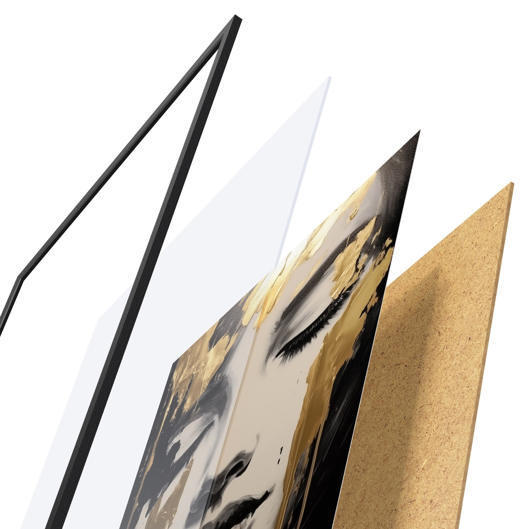 El póster consta de marco, plexiglás, imagen impresa y soporte de aglomerado. El póster puede colgarse inmediatamente en la pared gracias a los soportes de la parte posterior.