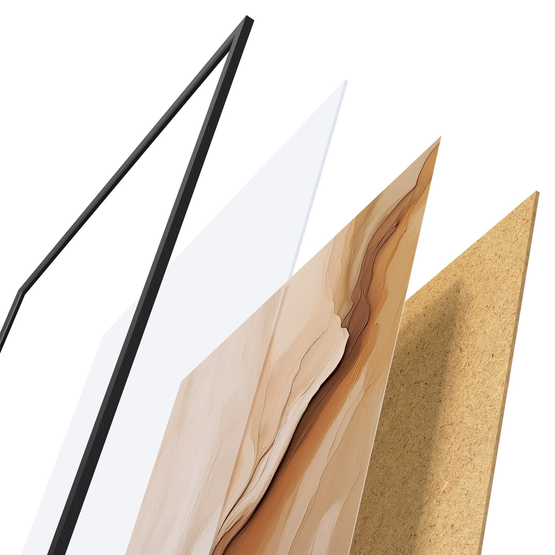 El póster consta de marco, plexiglás, imagen impresa y soporte de aglomerado. El póster puede colgarse inmediatamente en la pared gracias a los soportes de la parte posterior.