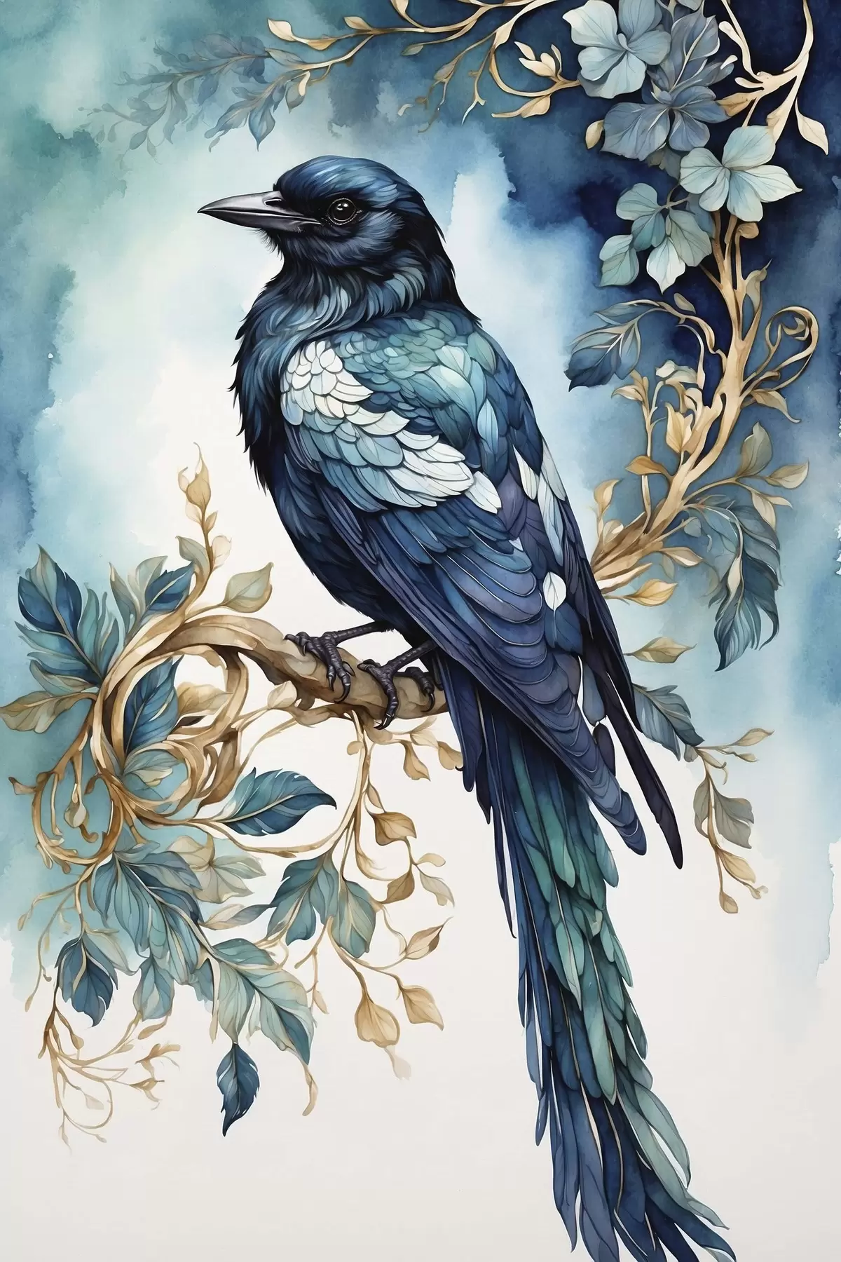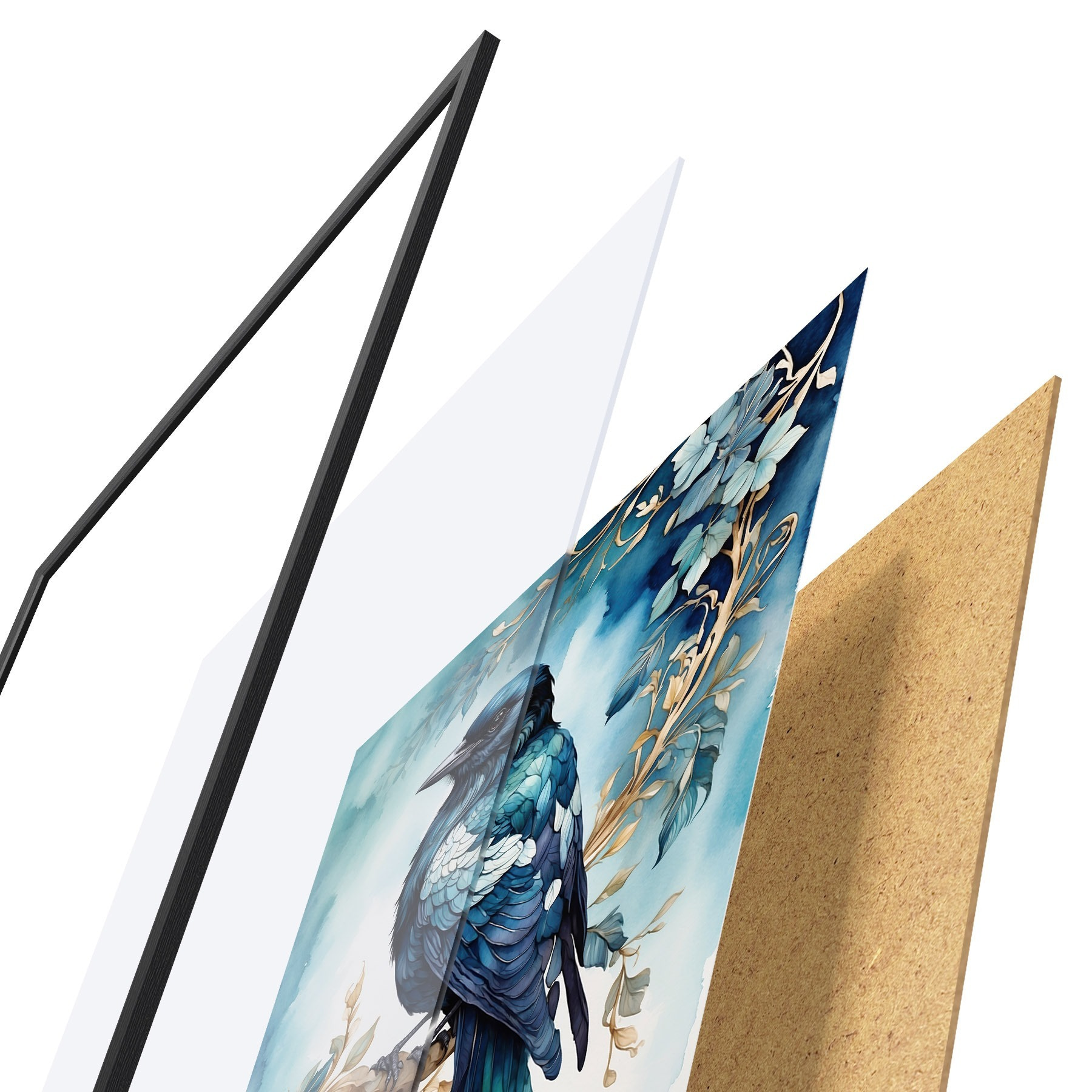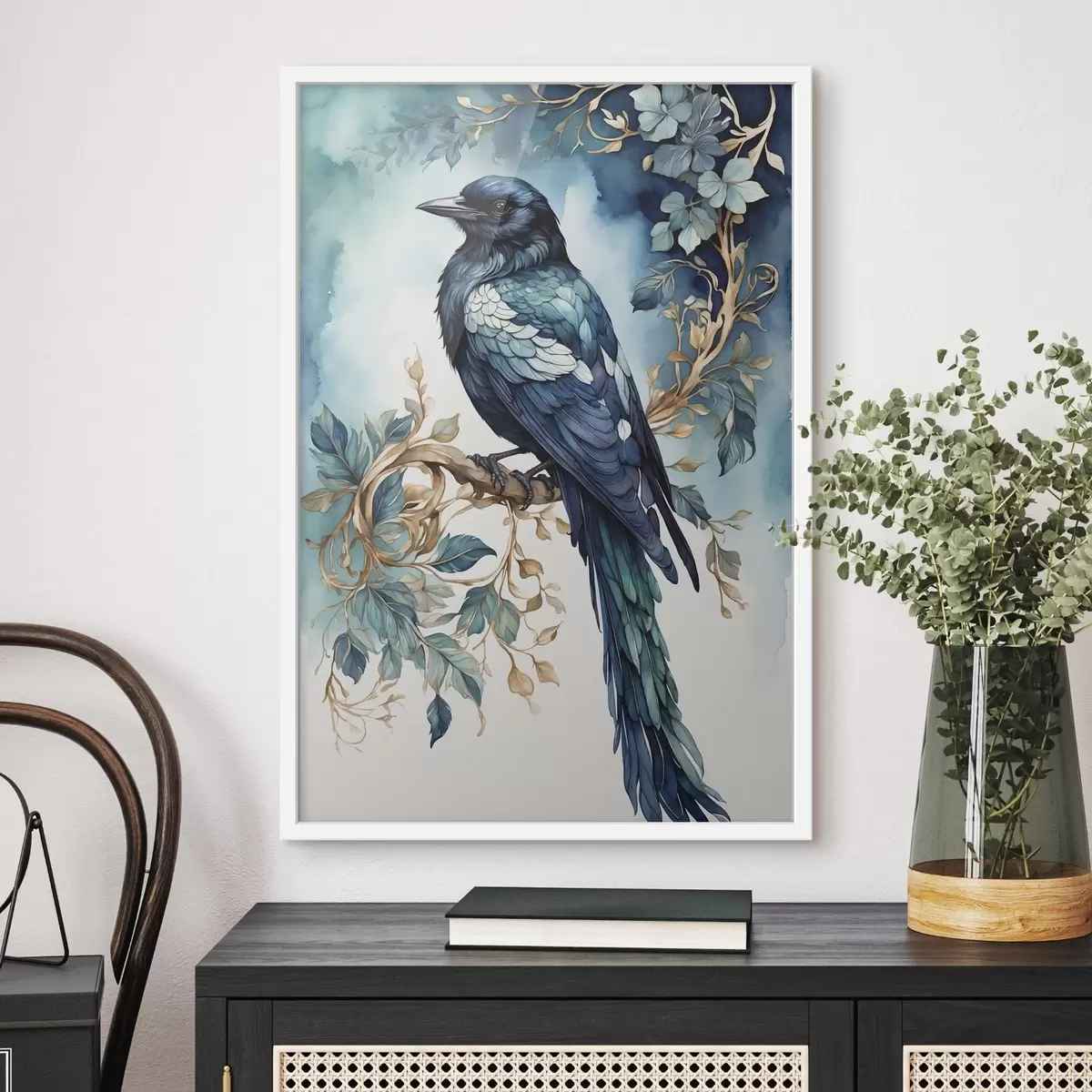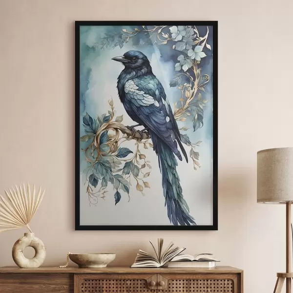 Poster Pájaro azul en una rama con hojas estilo acuarela Nr f45483