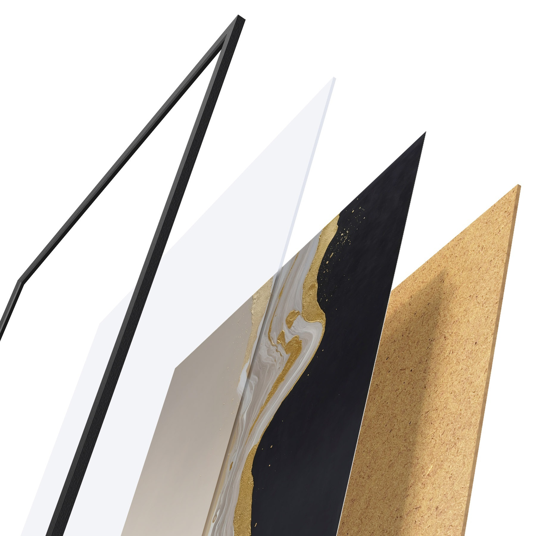 El póster consta de marco, plexiglás, imagen impresa y soporte de aglomerado. El póster puede colgarse inmediatamente en la pared gracias a los soportes de la parte posterior.