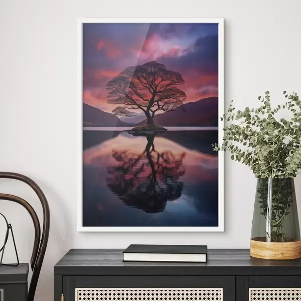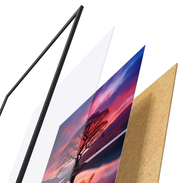 El póster consta de marco, plexiglás, imagen impresa y soporte de aglomerado. El póster puede colgarse inmediatamente en la pared gracias a los soportes de la parte posterior.
