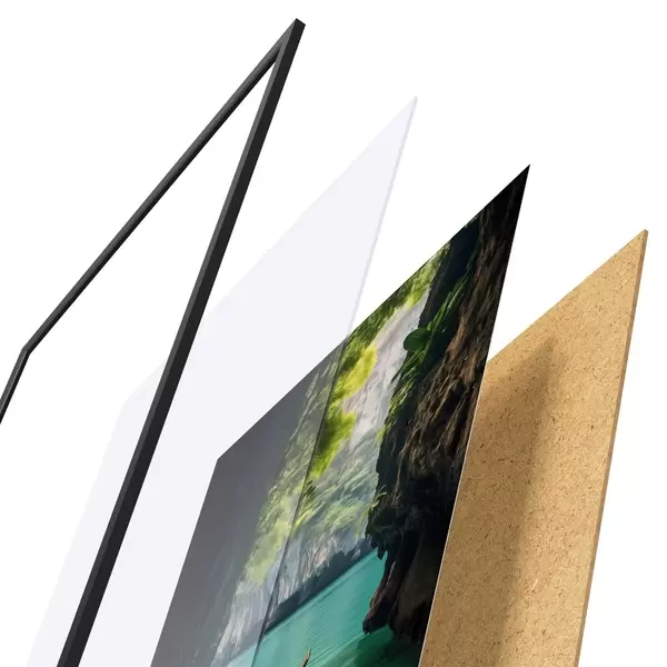 El póster consta de marco, plexiglás, imagen impresa y soporte de aglomerado. El póster puede colgarse inmediatamente en la pared gracias a los soportes de la parte posterior.