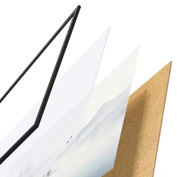 El póster consta de marco, plexiglás, imagen impresa y soporte de aglomerado. El póster puede colgarse inmediatamente en la pared gracias a los soportes de la parte posterior.