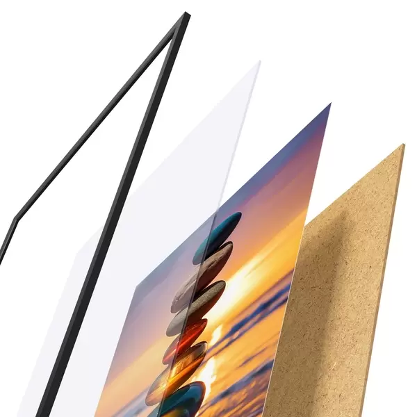 El póster consta de marco, plexiglás, imagen impresa y soporte de aglomerado. El póster puede colgarse inmediatamente en la pared gracias a los soportes de la parte posterior.