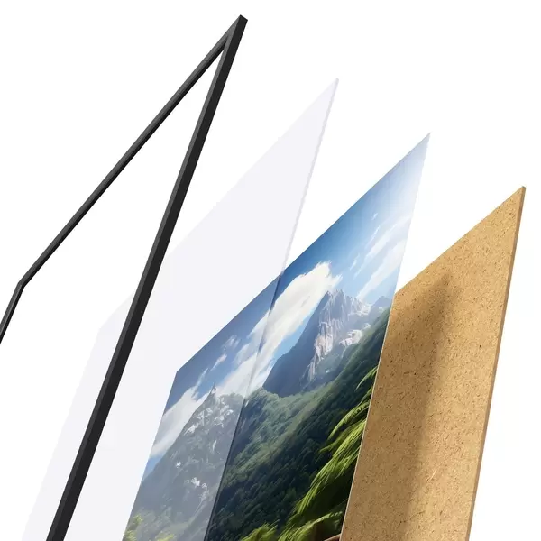 El póster consta de marco, plexiglás, imagen impresa y soporte de aglomerado. El póster puede colgarse inmediatamente en la pared gracias a los soportes de la parte posterior.