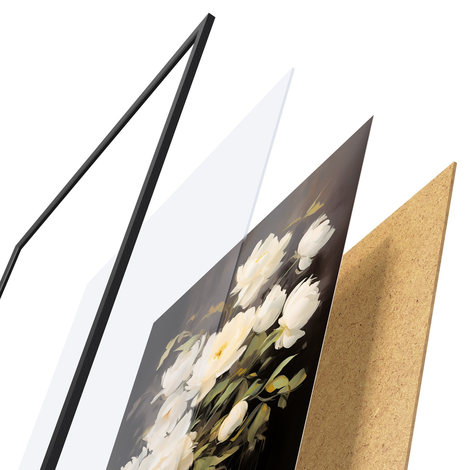 El póster consta de marco, plexiglás, imagen impresa y soporte de aglomerado. El póster puede colgarse inmediatamente en la pared gracias a los soportes de la parte posterior.