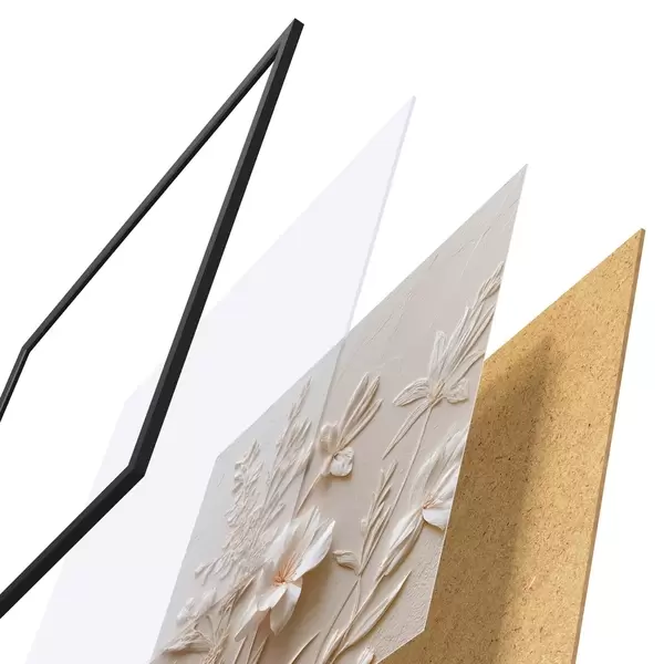 El póster consta de marco, plexiglás, imagen impresa y soporte de aglomerado. El póster puede colgarse inmediatamente en la pared gracias a los soportes de la parte posterior.