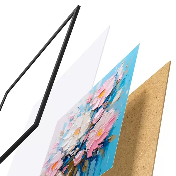El póster consta de marco, plexiglás, imagen impresa y soporte de aglomerado. El póster puede colgarse inmediatamente en la pared gracias a los soportes de la parte posterior.