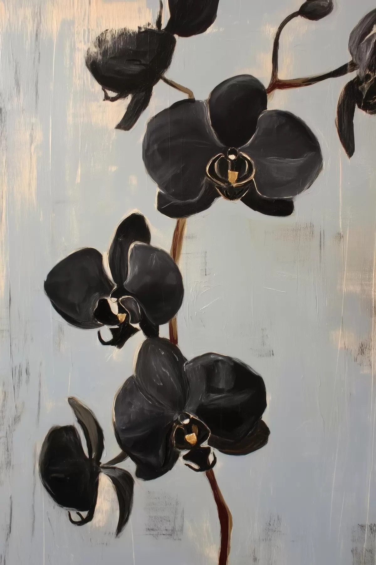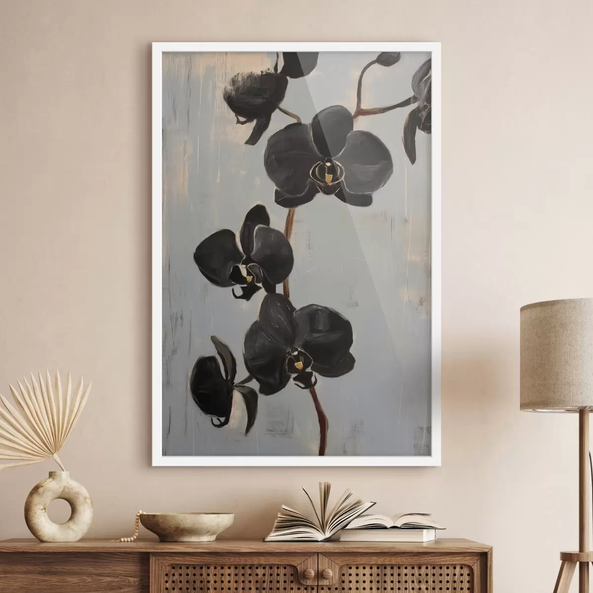 Poster Orquídeas decorativas: flores negras sobre fondo gris f45547