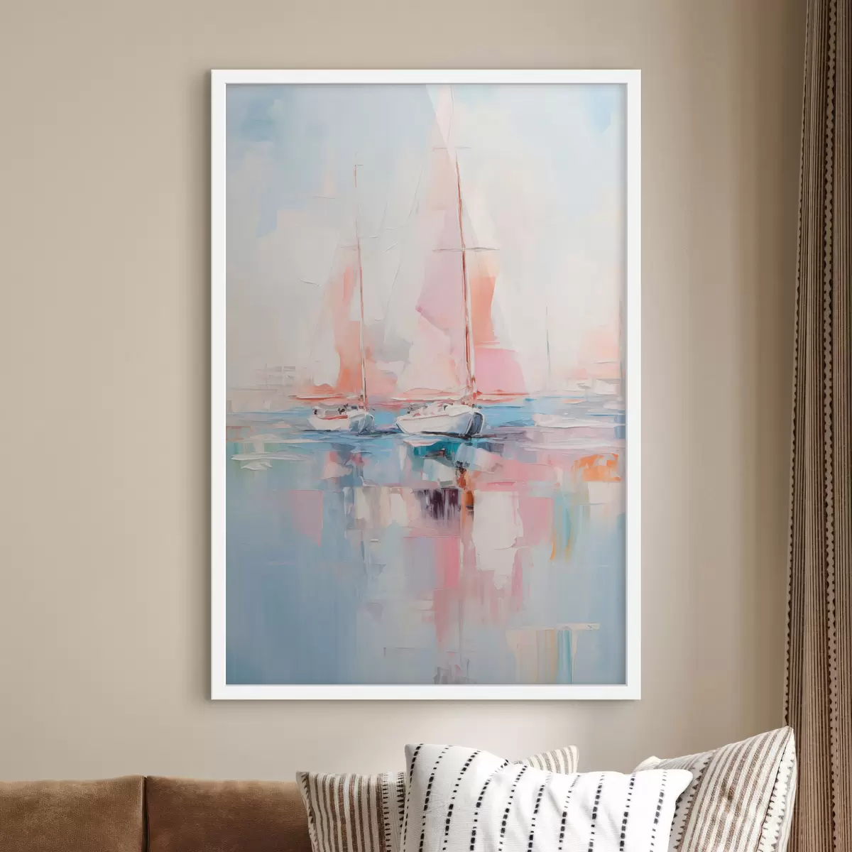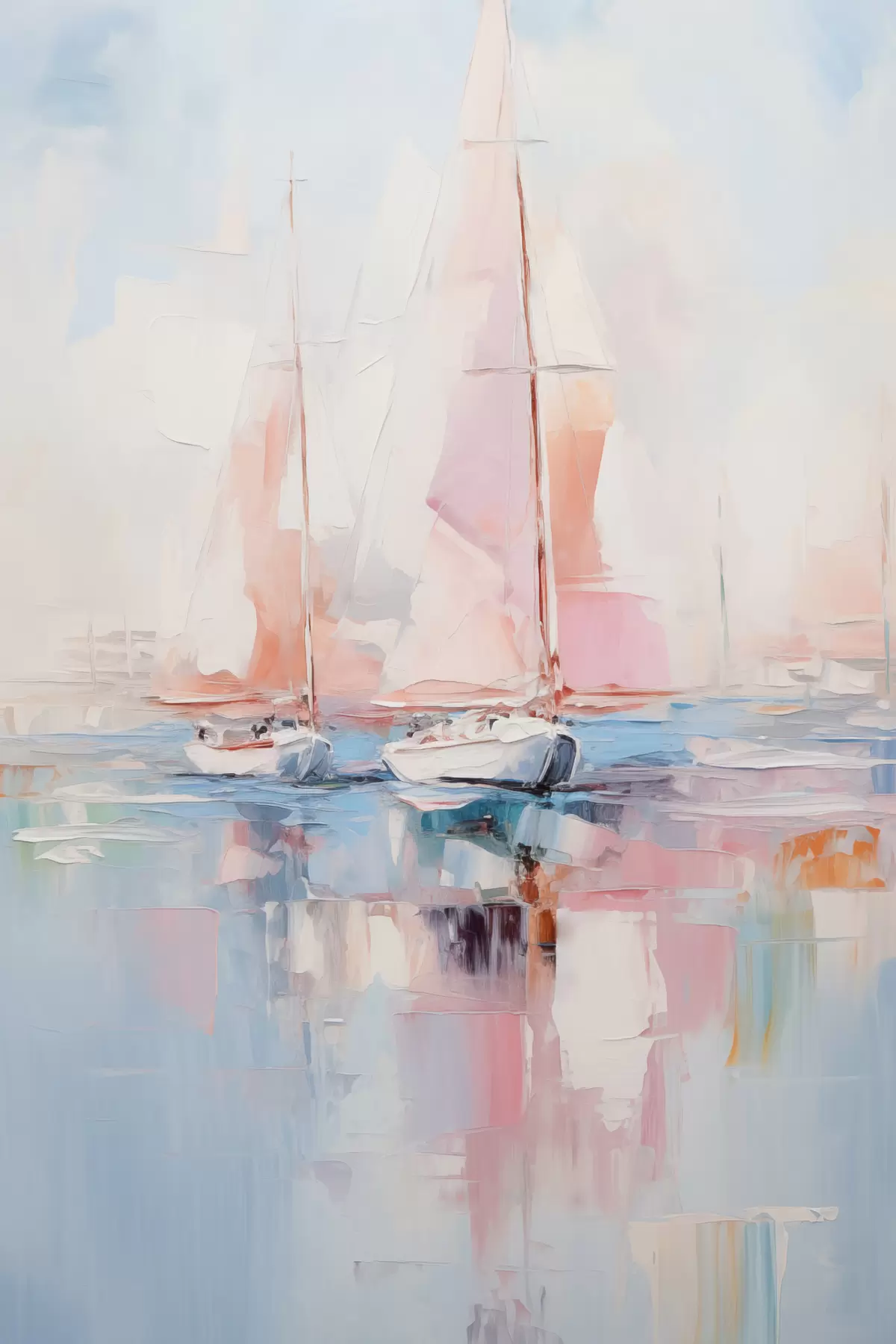 Poster Veleros con velas rosas flotando en un mar en calma, reflejos de los barcos en el agua, suaves colores pastel Nr f45557