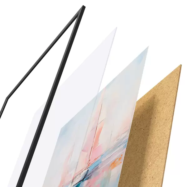 El póster consta de marco, plexiglás, imagen impresa y soporte de aglomerado. El póster puede colgarse inmediatamente en la pared gracias a los soportes de la parte posterior.