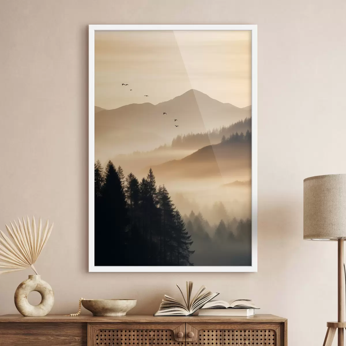 Poster Un paisaje montañoso con un bosque y pájaros volando en el cielo , todo cubierto por una espesa capa de niebla durante el amanecer f45563
