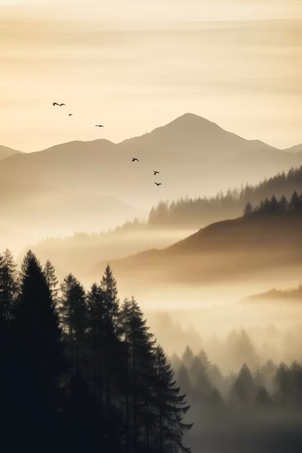 Poster Un paisaje montañoso con un bosque y pájaros volando en el cielo , todo cubierto por una espesa capa de niebla durante el amanecer f45563