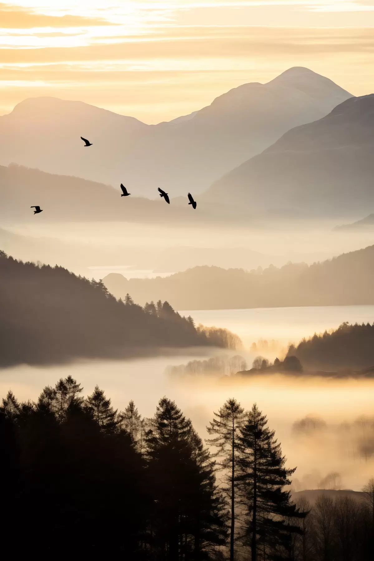 Poster Un paisaje montañoso con un bosque y pájaros volando en el cielo , todo cubierto por una espesa capa de niebla durante el amanecer f45564