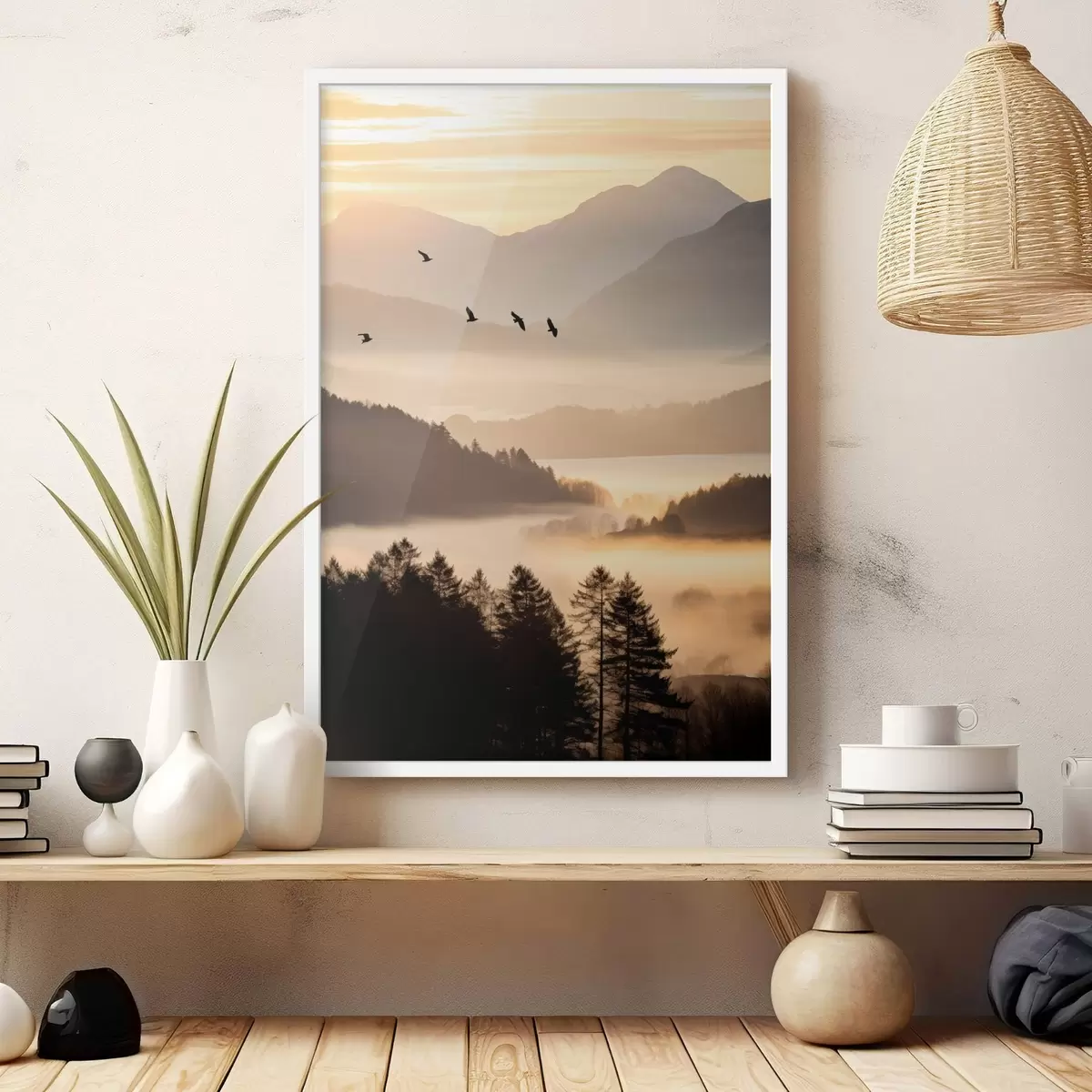 Poster Un paisaje montañoso con un bosque y pájaros volando en el cielo , todo cubierto por una espesa capa de niebla durante el amanecer Nr f45564