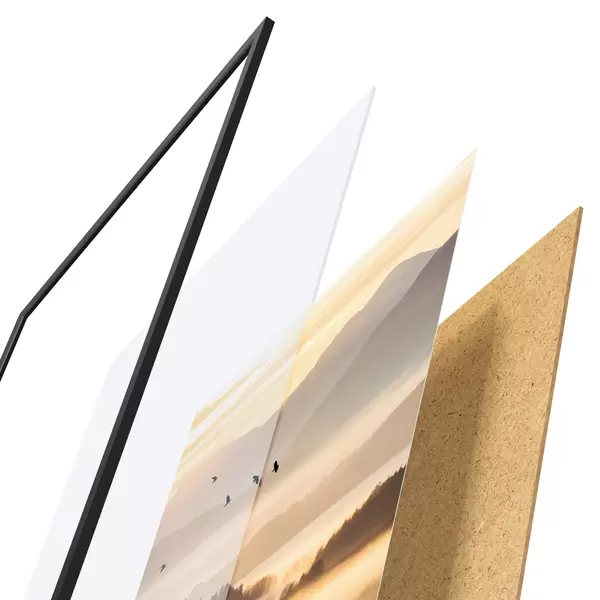El póster consta de marco, plexiglás, imagen impresa y soporte de aglomerado. El póster puede colgarse inmediatamente en la pared gracias a los soportes de la parte posterior.