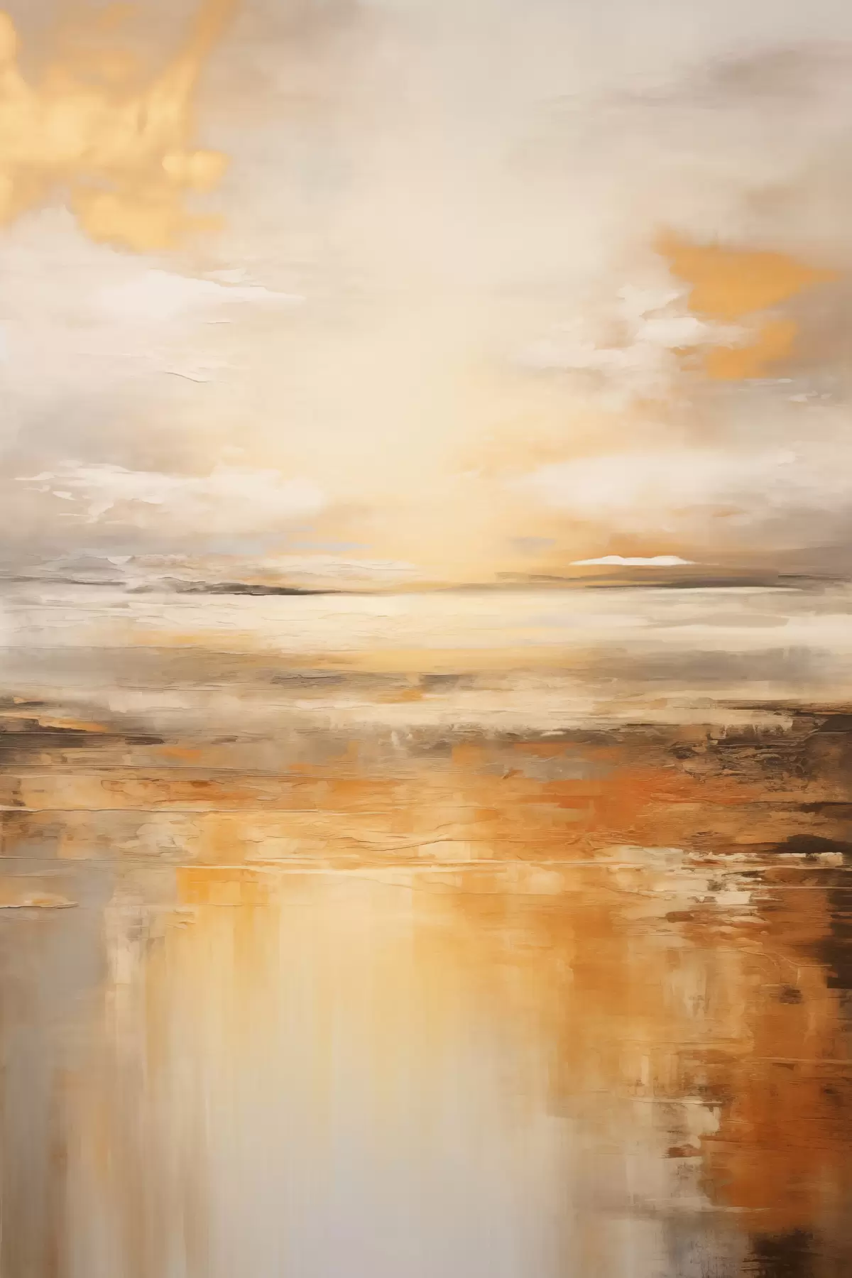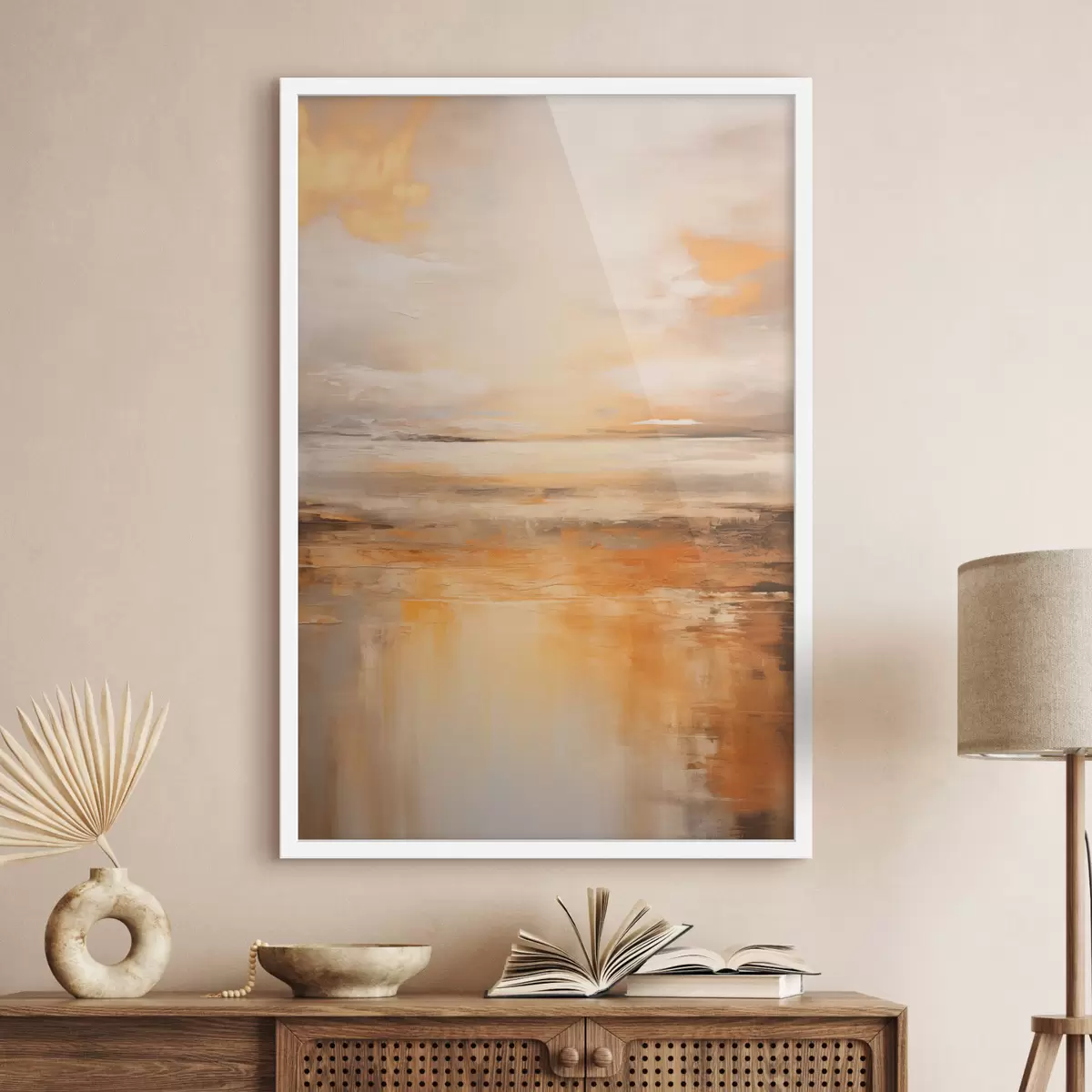 Poster Una pintura abstracta de un paisaje de playa con un océano tranquilo , arena naranja y un cielo nublado con sol Nr f45567