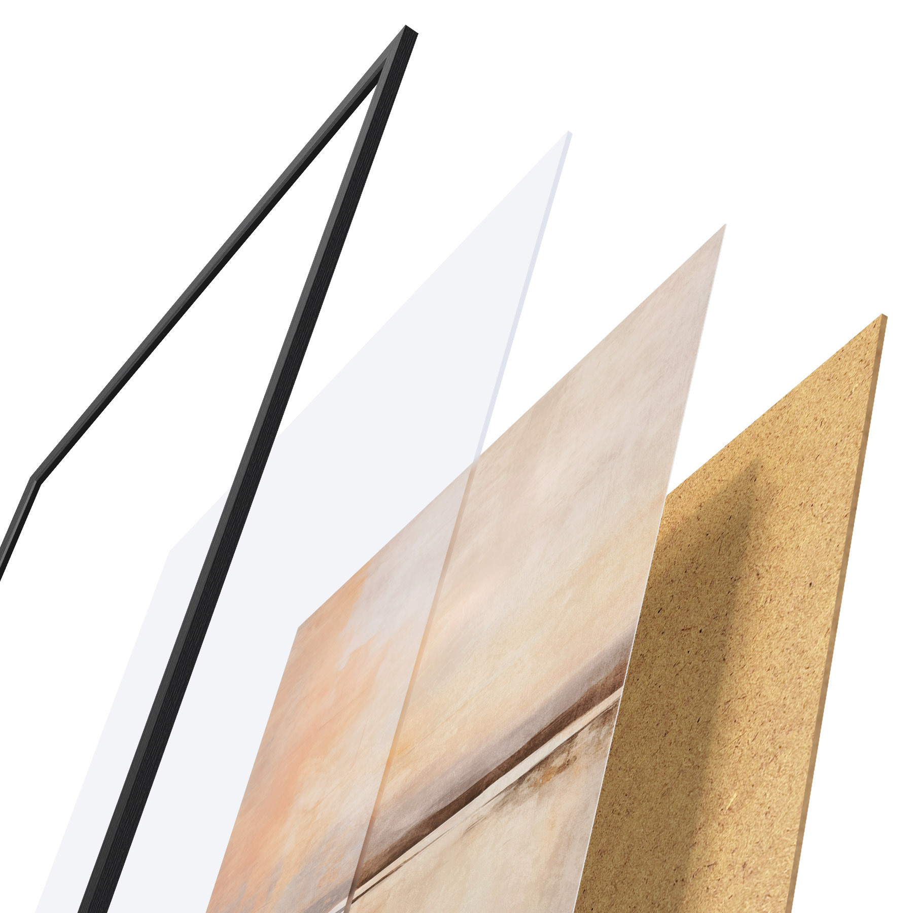 El póster consta de marco, plexiglás, imagen impresa y soporte de aglomerado. El póster puede colgarse inmediatamente en la pared gracias a los soportes de la parte posterior.