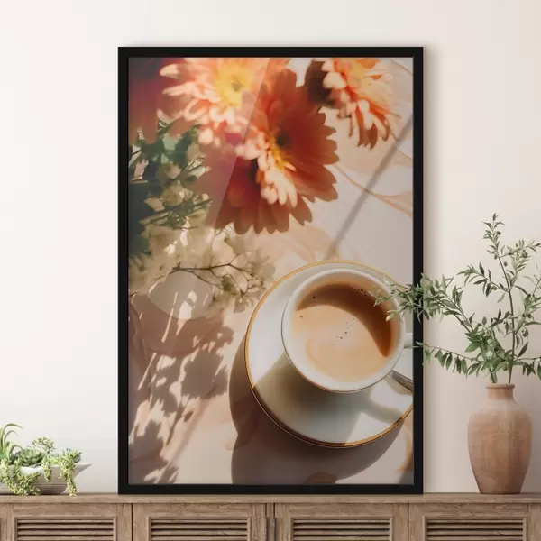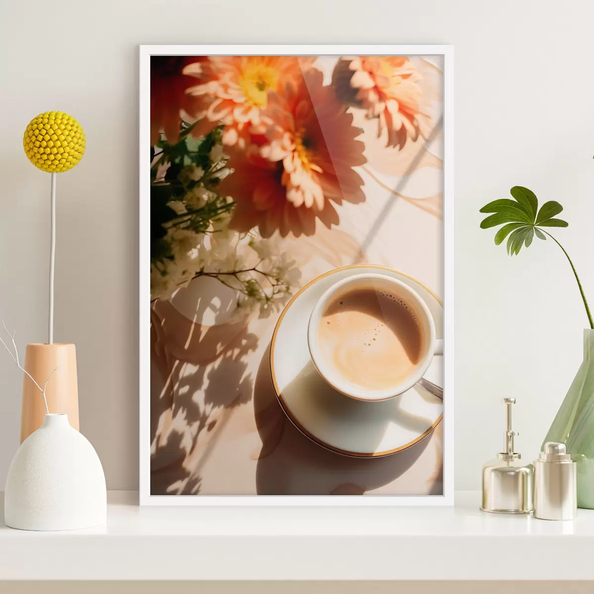 Poster Una taza de café con espuma en un plato blanco, unas flores al fondo, con luz solar Nr f45570