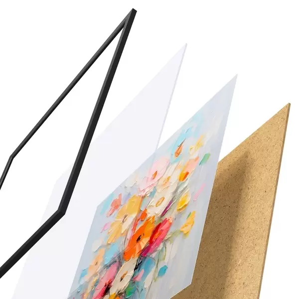 El póster consta de marco, plexiglás, imagen impresa y soporte de aglomerado. El póster puede colgarse inmediatamente en la pared gracias a los soportes de la parte posterior.