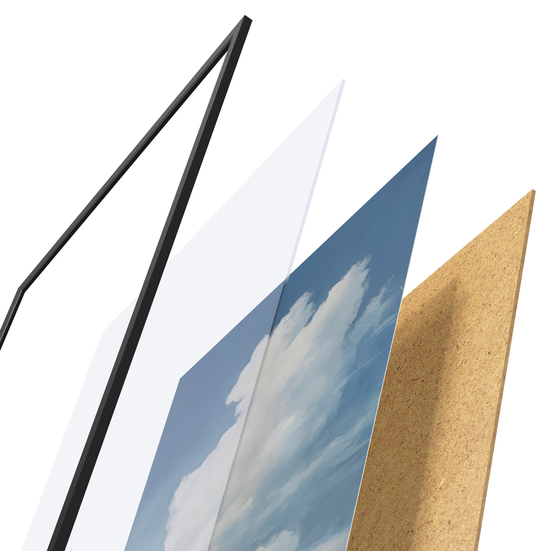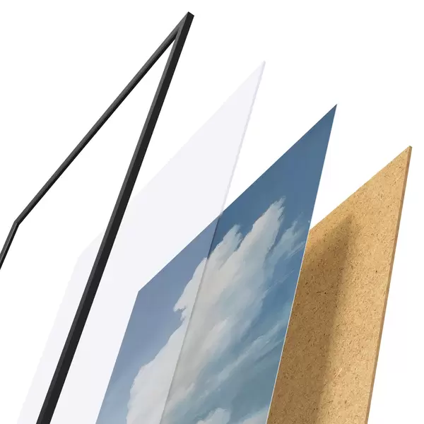 El póster consta de marco, plexiglás, imagen impresa y soporte de aglomerado. El póster puede colgarse inmediatamente en la pared gracias a los soportes de la parte posterior.
