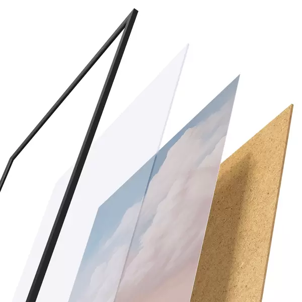 El póster consta de marco, plexiglás, imagen impresa y soporte de aglomerado. El póster puede colgarse inmediatamente en la pared gracias a los soportes de la parte posterior.
