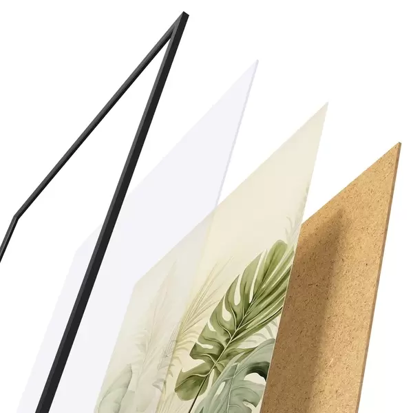El póster consta de marco, plexiglás, imagen impresa y soporte de aglomerado. El póster puede colgarse inmediatamente en la pared gracias a los soportes de la parte posterior.