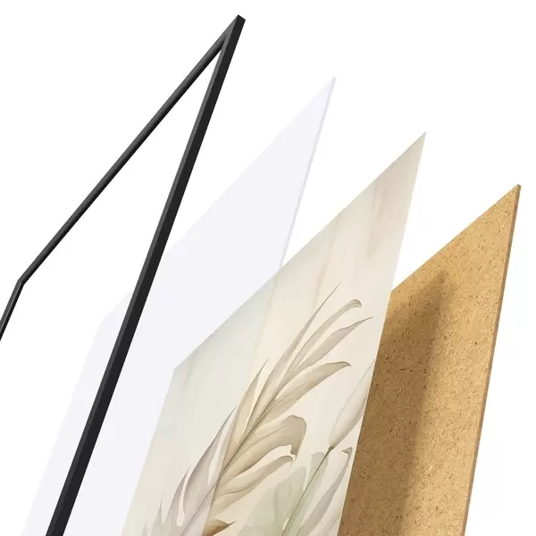 El póster consta de marco, plexiglás, imagen impresa y soporte de aglomerado. El póster puede colgarse inmediatamente en la pared gracias a los soportes de la parte posterior.