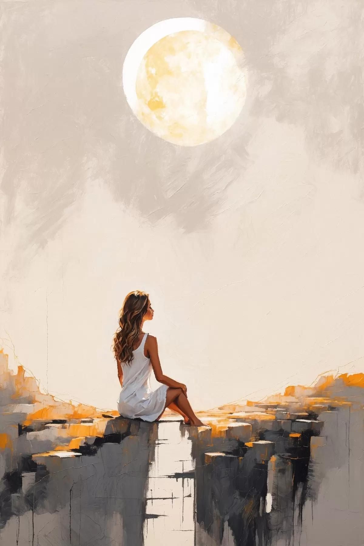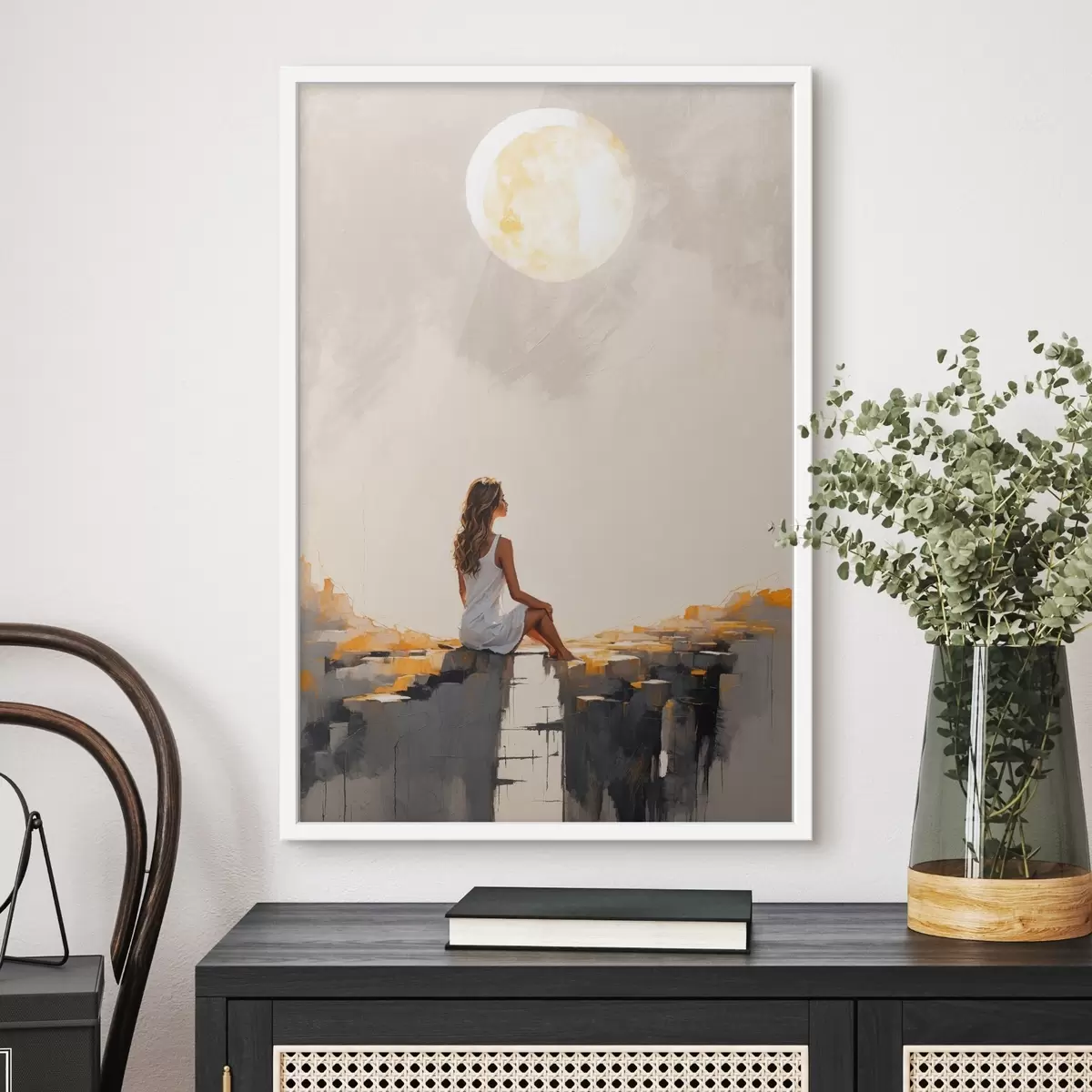 Poster Chica con vestido blanco sentada bajo una gran luna Nr f45621