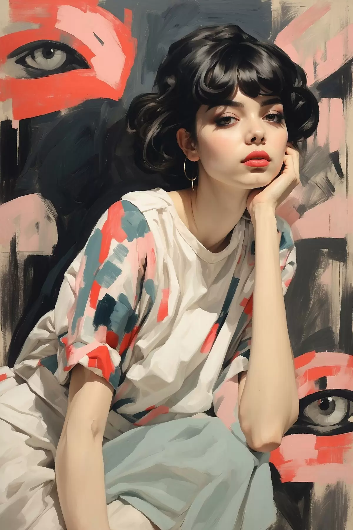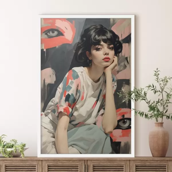 Poster Retrato de niña sobre fondo con ojos y trazos abstractos f45623