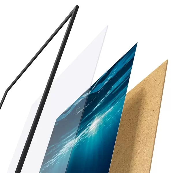 El póster consta de marco, plexiglás, imagen impresa y soporte de aglomerado. El póster puede colgarse inmediatamente en la pared gracias a los soportes de la parte posterior.