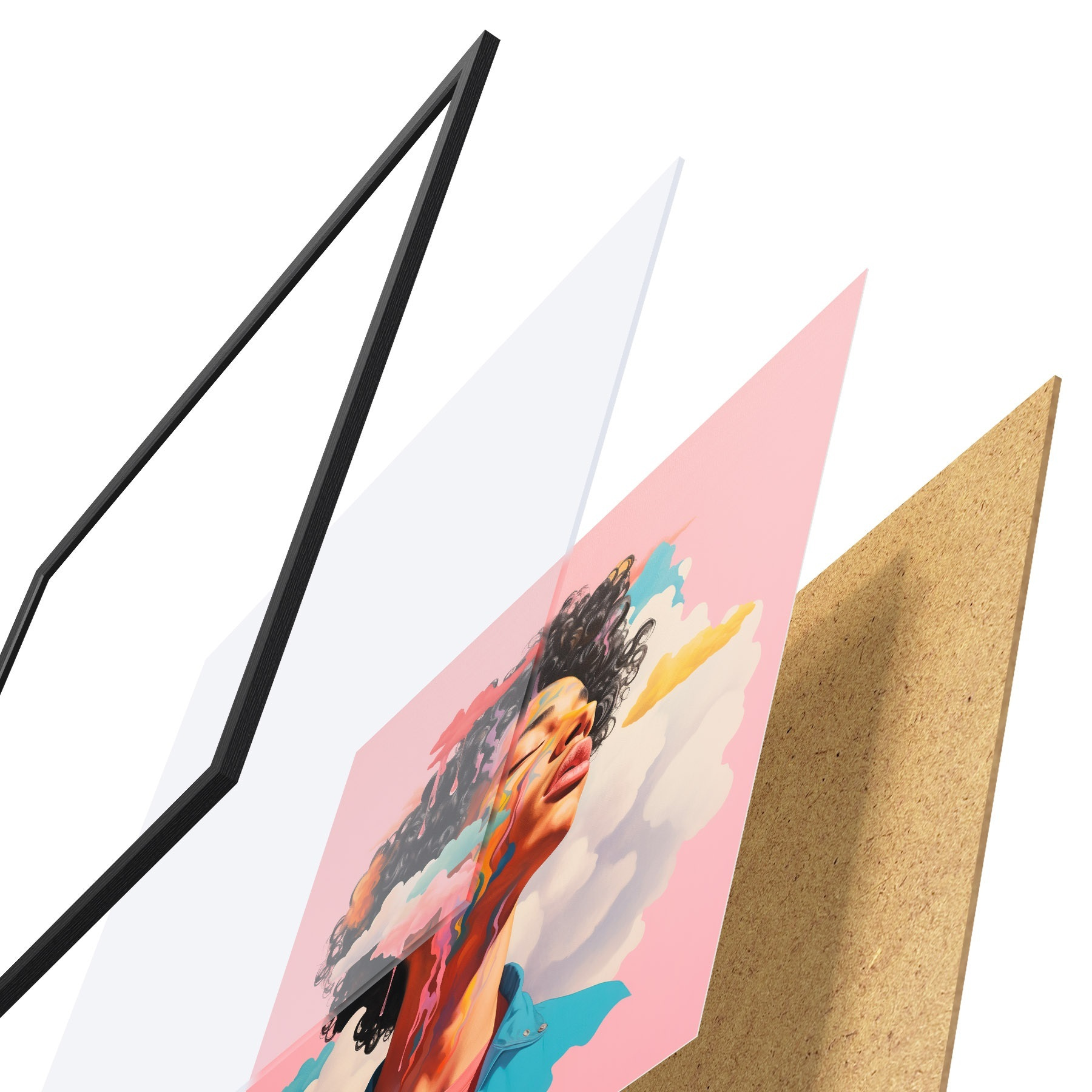El póster consta de marco, plexiglás, imagen impresa y soporte de aglomerado. El póster puede colgarse inmediatamente en la pared gracias a los soportes de la parte posterior.