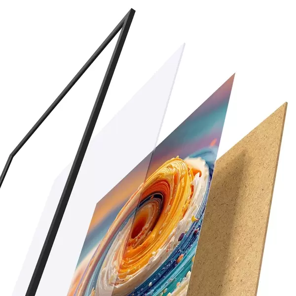 El póster consta de marco, plexiglás, imagen impresa y soporte de aglomerado. El póster puede colgarse inmediatamente en la pared gracias a los soportes de la parte posterior.