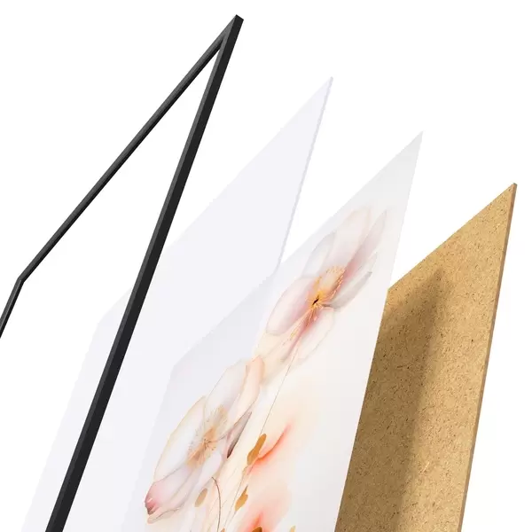 El póster consta de marco, plexiglás, imagen impresa y soporte de aglomerado. El póster puede colgarse inmediatamente en la pared gracias a los soportes de la parte posterior.