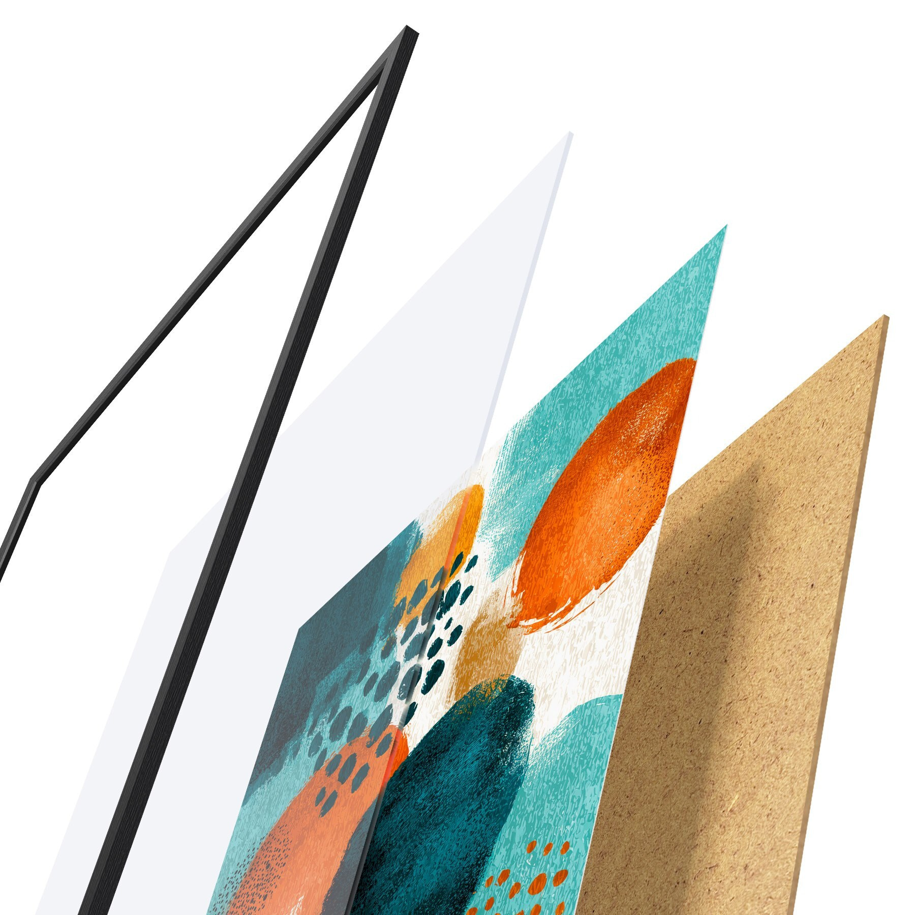 El póster consta de marco, plexiglás, imagen impresa y soporte de aglomerado. El póster puede colgarse inmediatamente en la pared gracias a los soportes de la parte posterior.