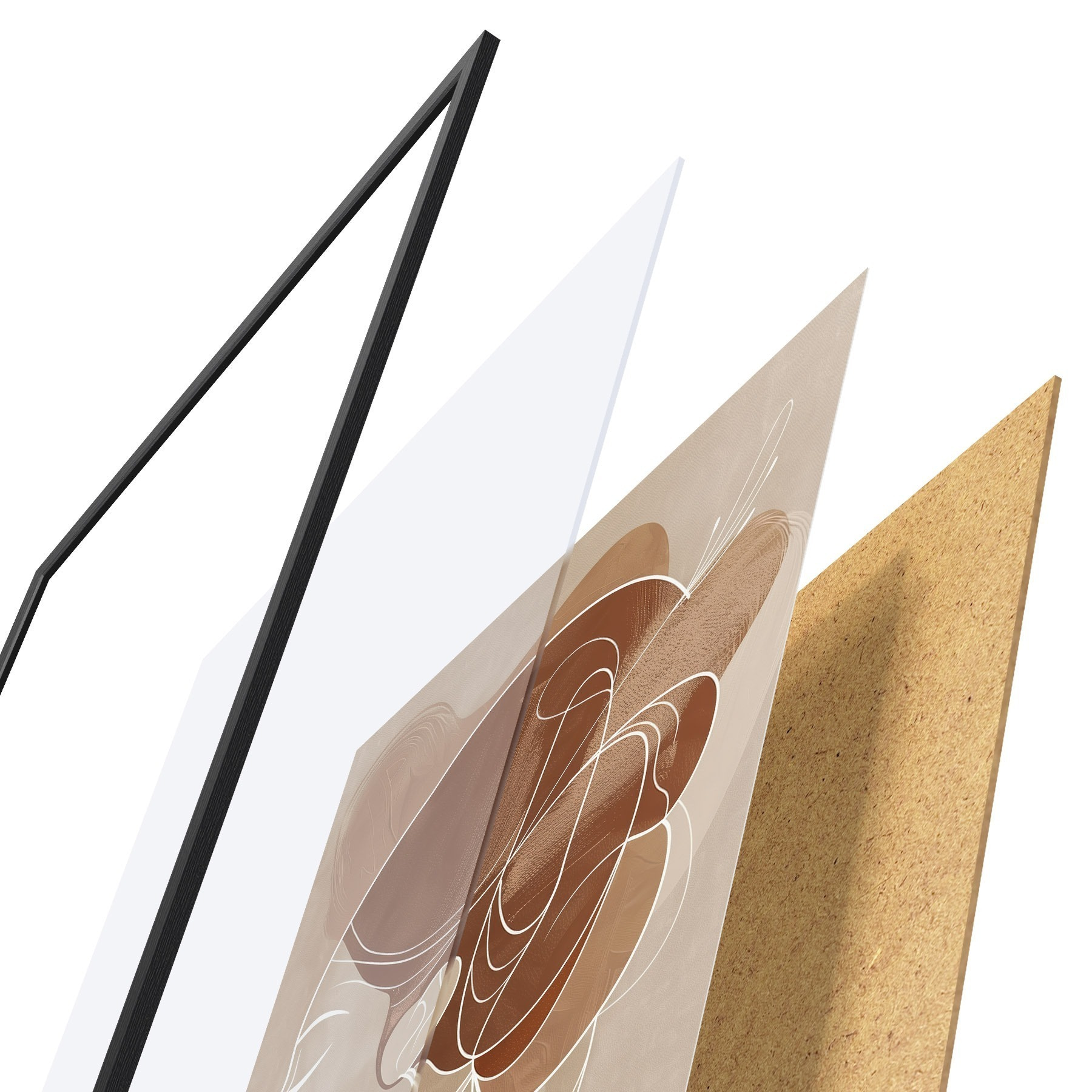 El póster consta de marco, plexiglás, imagen impresa y soporte de aglomerado. El póster puede colgarse inmediatamente en la pared gracias a los soportes de la parte posterior.