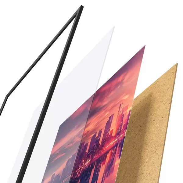 El póster consta de marco, plexiglás, imagen impresa y soporte de aglomerado. El póster puede colgarse inmediatamente en la pared gracias a los soportes de la parte posterior.