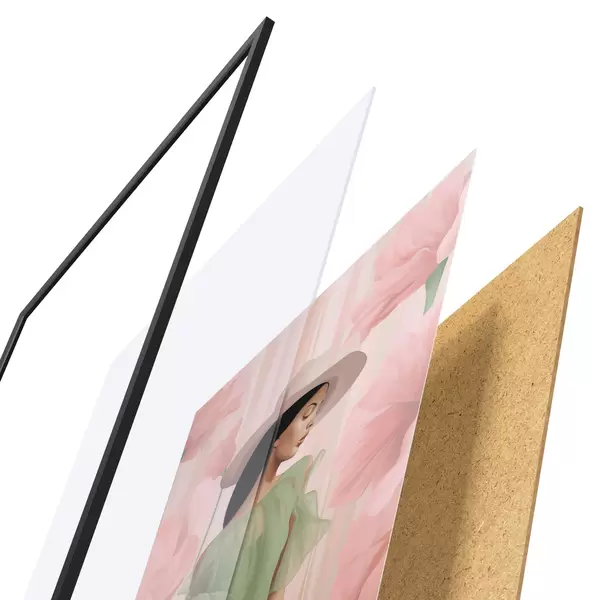 El póster consta de marco, plexiglás, imagen impresa y soporte de aglomerado. El póster puede colgarse inmediatamente en la pared gracias a los soportes de la parte posterior.