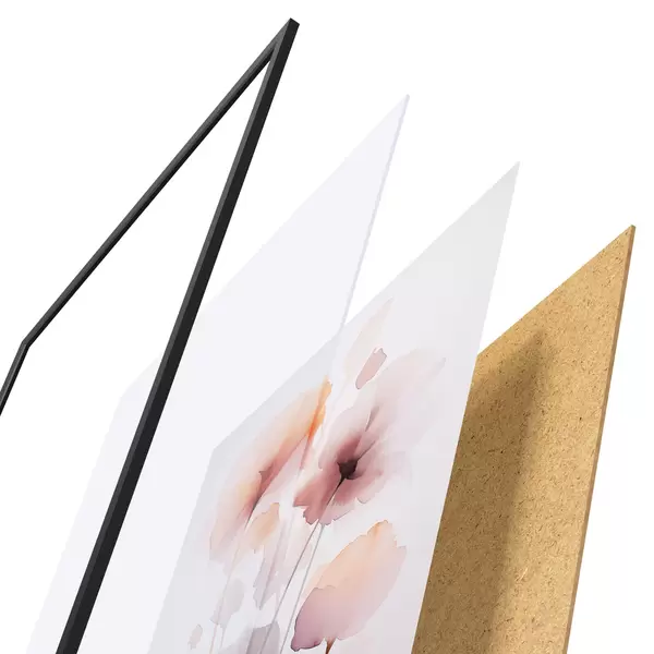 El póster consta de marco, plexiglás, imagen impresa y soporte de aglomerado. El póster puede colgarse inmediatamente en la pared gracias a los soportes de la parte posterior.