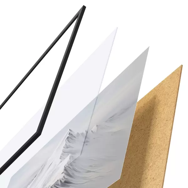 El póster consta de marco, plexiglás, imagen impresa y soporte de aglomerado. El póster puede colgarse inmediatamente en la pared gracias a los soportes de la parte posterior.