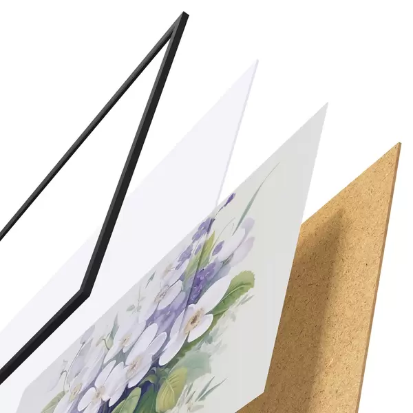 El póster consta de marco, plexiglás, imagen impresa y soporte de aglomerado. El póster puede colgarse inmediatamente en la pared gracias a los soportes de la parte posterior.