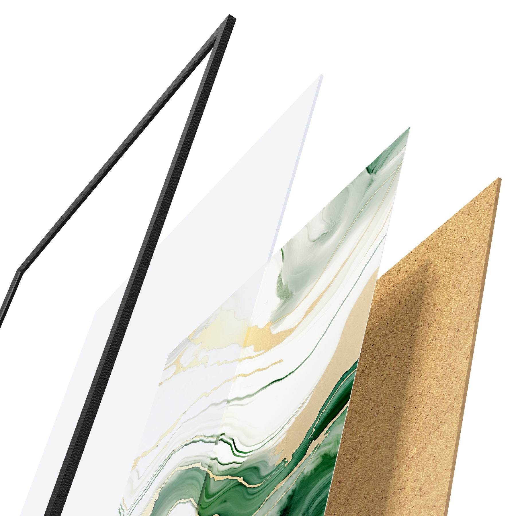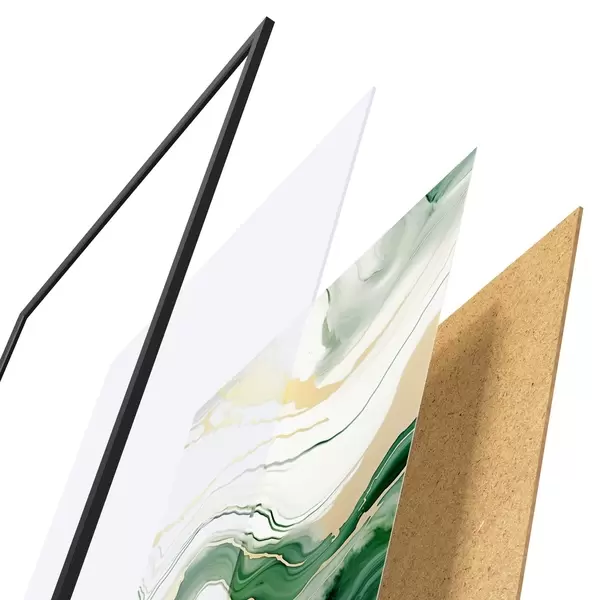 El póster consta de marco, plexiglás, imagen impresa y soporte de aglomerado. El póster puede colgarse inmediatamente en la pared gracias a los soportes de la parte posterior.
