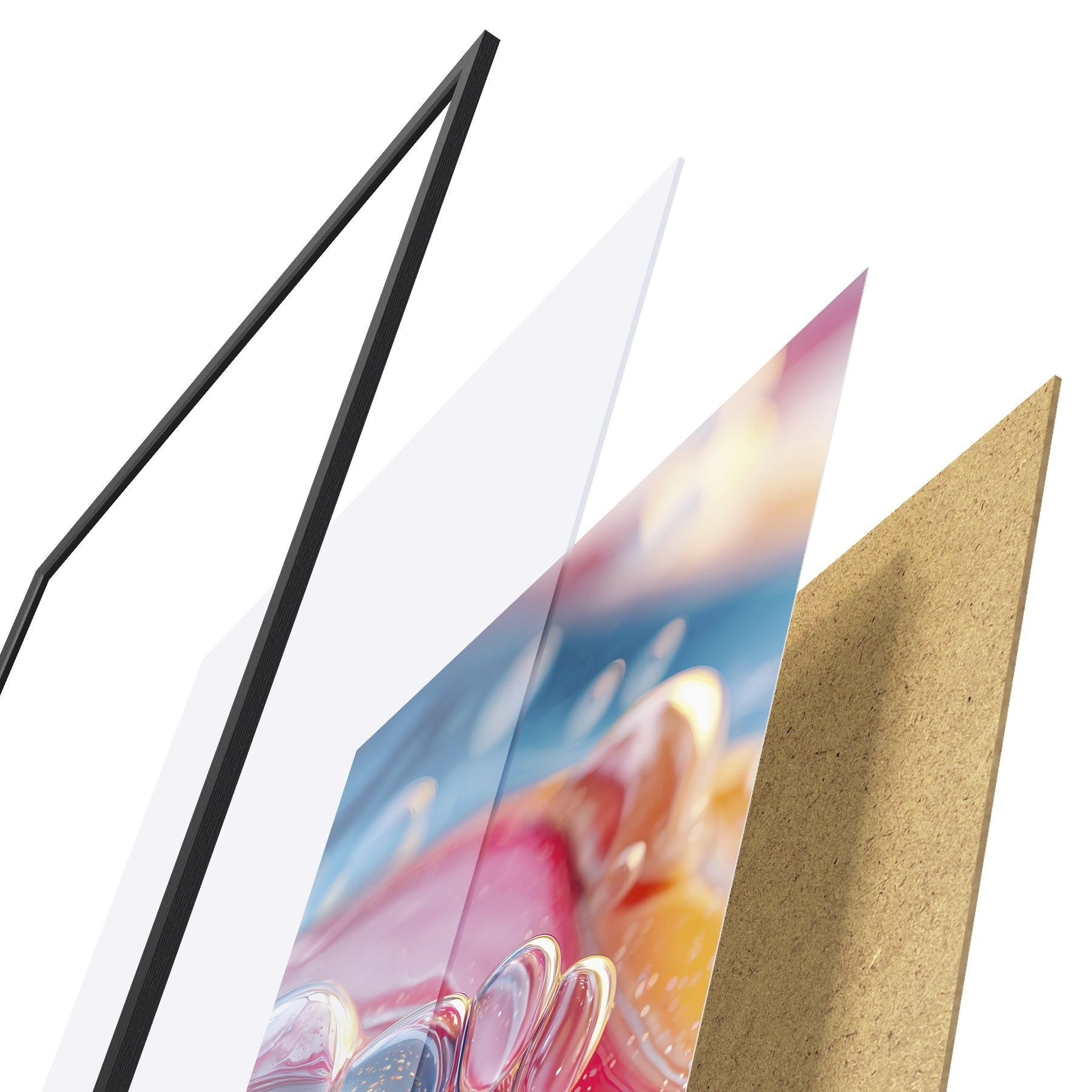 El póster consta de marco, plexiglás, imagen impresa y soporte de aglomerado. El póster puede colgarse inmediatamente en la pared gracias a los soportes de la parte posterior.