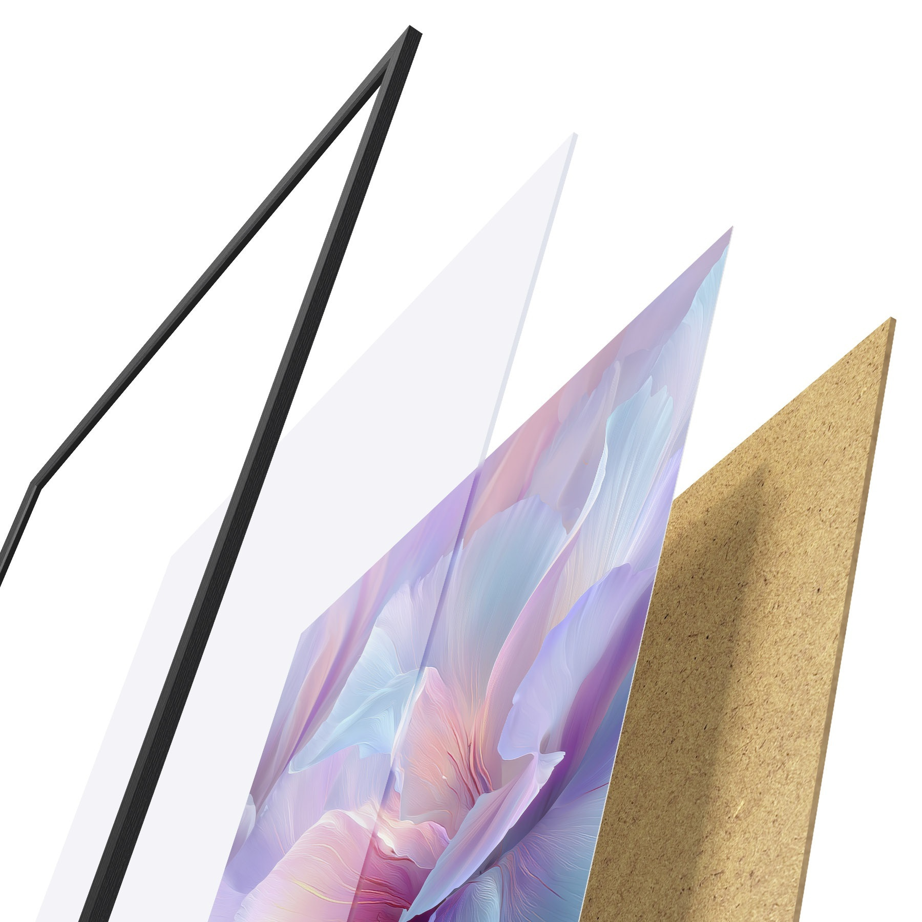 El póster consta de marco, plexiglás, imagen impresa y soporte de aglomerado. El póster puede colgarse inmediatamente en la pared gracias a los soportes de la parte posterior.