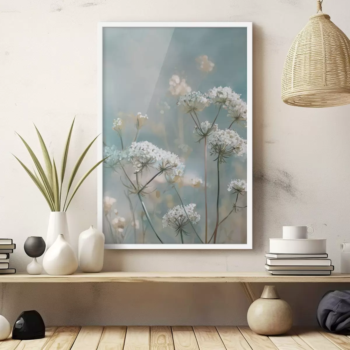Poster Flores de Queen Anne's Lace en estilo acuarela sobre fondo azul f45721
