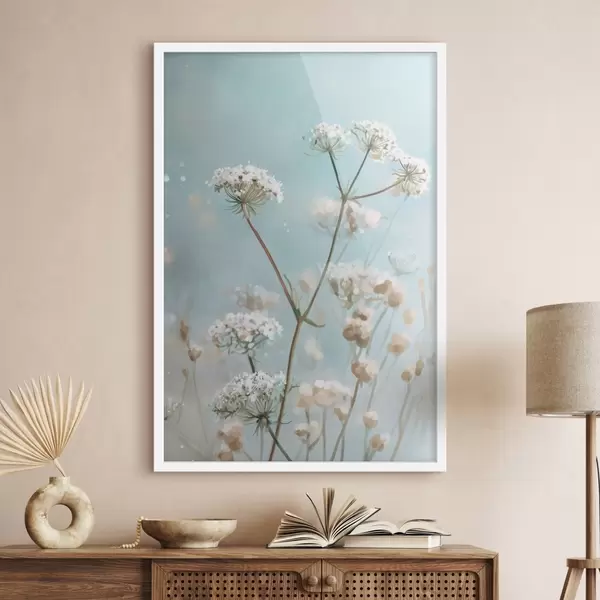 Poster Flores de Queen Anne's Lace en estilo acuarela sobre fondo azul f45722